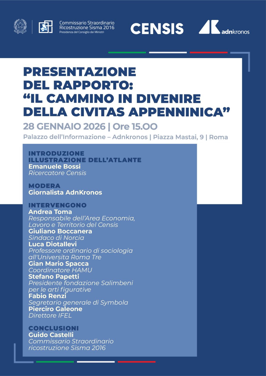 Di questi temi si parlerà mercoledì 28 gennaio 2026, a Roma, presso il Palazzo dell’Informazione – Adnkronos, in occasione della presentazione del Rapporto Censis “Il cammino in divenire della Civitas appenninica”. Il Rapporto propone un’analisi approfondita delle trasformazioni in atto e delle opportunità culturali di rigenerazione dei territori appenninici, anche in relazione ai percorsi avviati nell’ambito della candidatura a Capitale Europea della Cultura 2033.