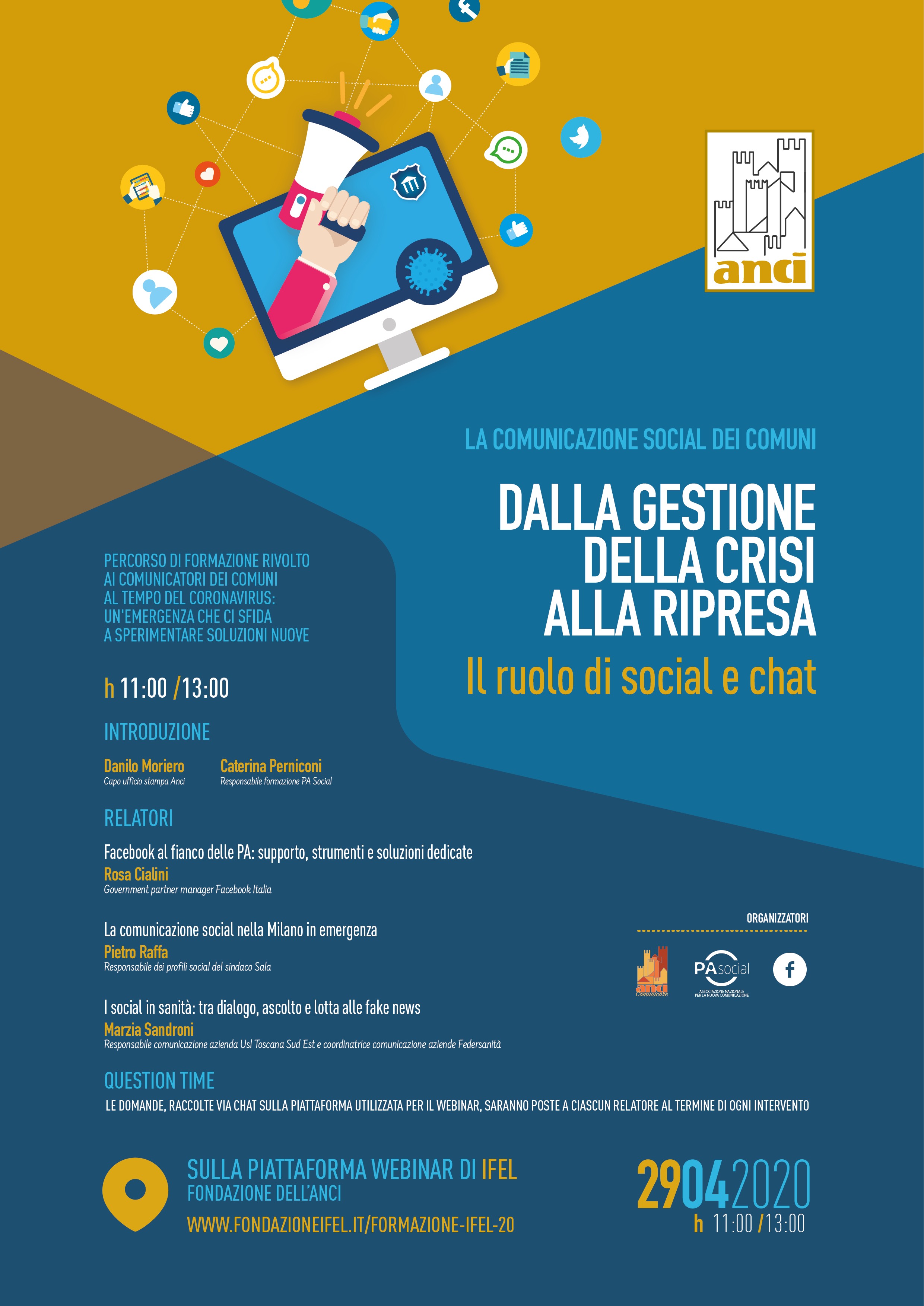 La comunicazione social dei Comuni Dalla gestione della crisi alla ripresa: il ruolo di social e chat Mercoledì 29 aprile 2020 - ore 11:00 - 13:00